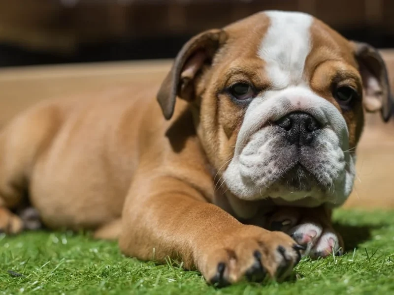 Medium English Bulldog puppy, gentle and loyal.Short, smooth coat; wrinkle care and moderate shedding.Great for calm, attentive owners.